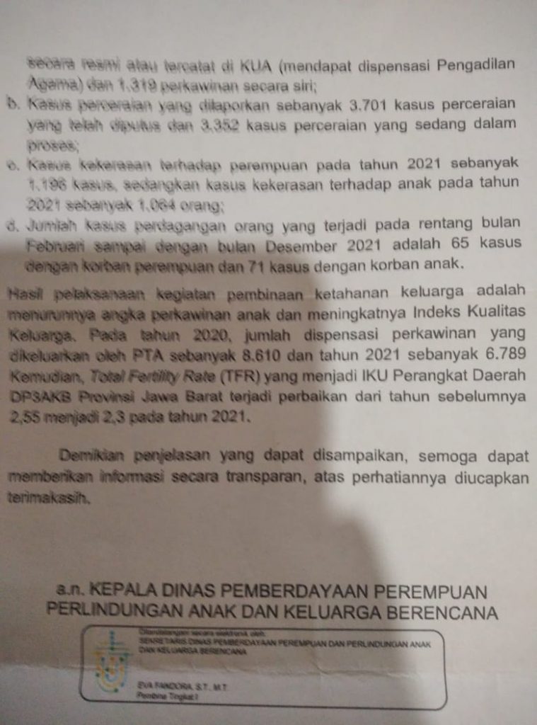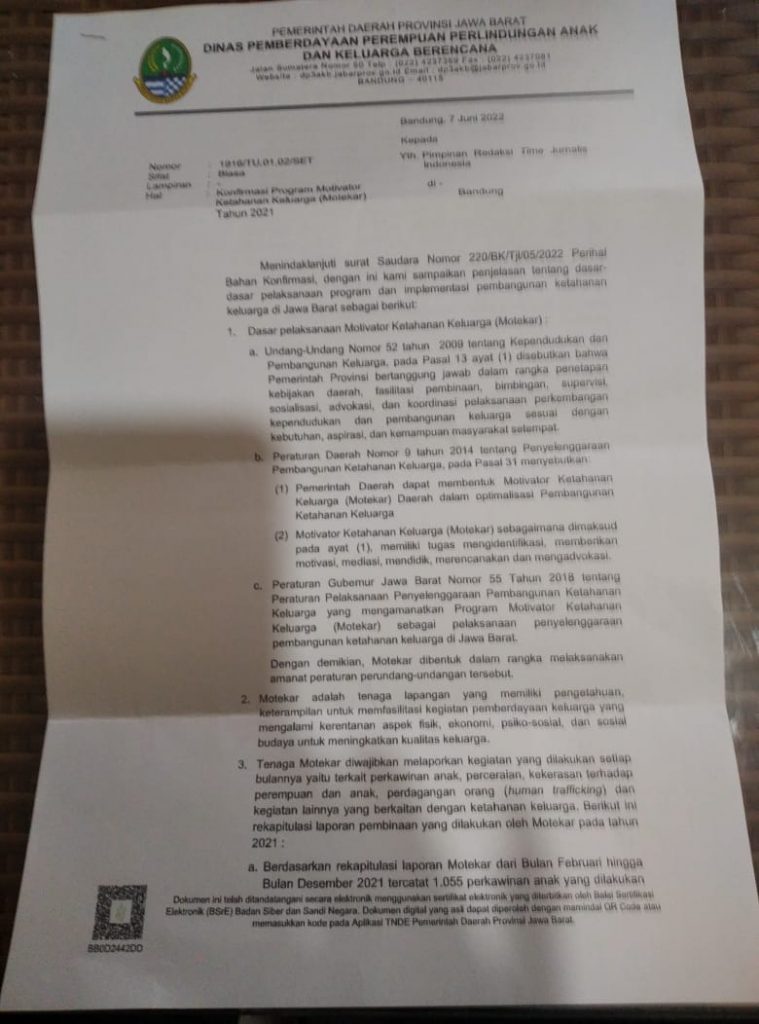 Namun, saat dikirim surat konfirmasi oleh Media TJI, pihak DP3AKB Jabar pun menjawab, hanya sayang jawaban yang mereka kirim tidak nyambung. Mereka hanya menjawab dan menjelaskan dasar pelaksanaan serta aturan-aturan undang-undang No. 52 Tahun 2009, Perda Jabar No. 9 Tahun 2014, Pergub Jabar No. 55 Tahun 2018 dan sedikit penjelasan mengenai pencapaian kinerja dari program Motekar tersebut.